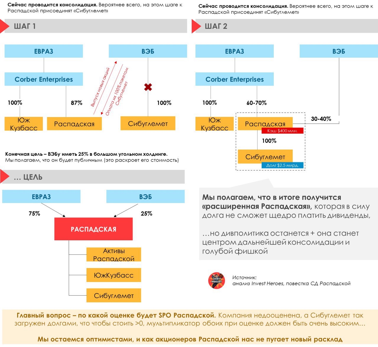 1. В итоге все угольные активы Евраза будут консолидированы у Corber (сейчас владеет ЮжКузбасом и Распадской), которого смогут вывести на международное IPO и оценить по значительно более высоким мультам, чем сейчас торгуется Распадская, а ВЭБ за акции Распадской получит долю в объединенном Corbere, в результате чего останется в плюсе.