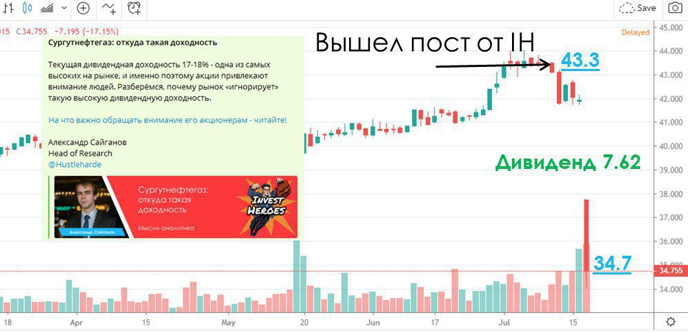 В этом посте мы разбирали, почему Сургутнефтегаз так много платит на префы (цена была 43.3). С тех пор Сургутнефтегаз уже значительно упал - и после отсечки продолжает снижение.