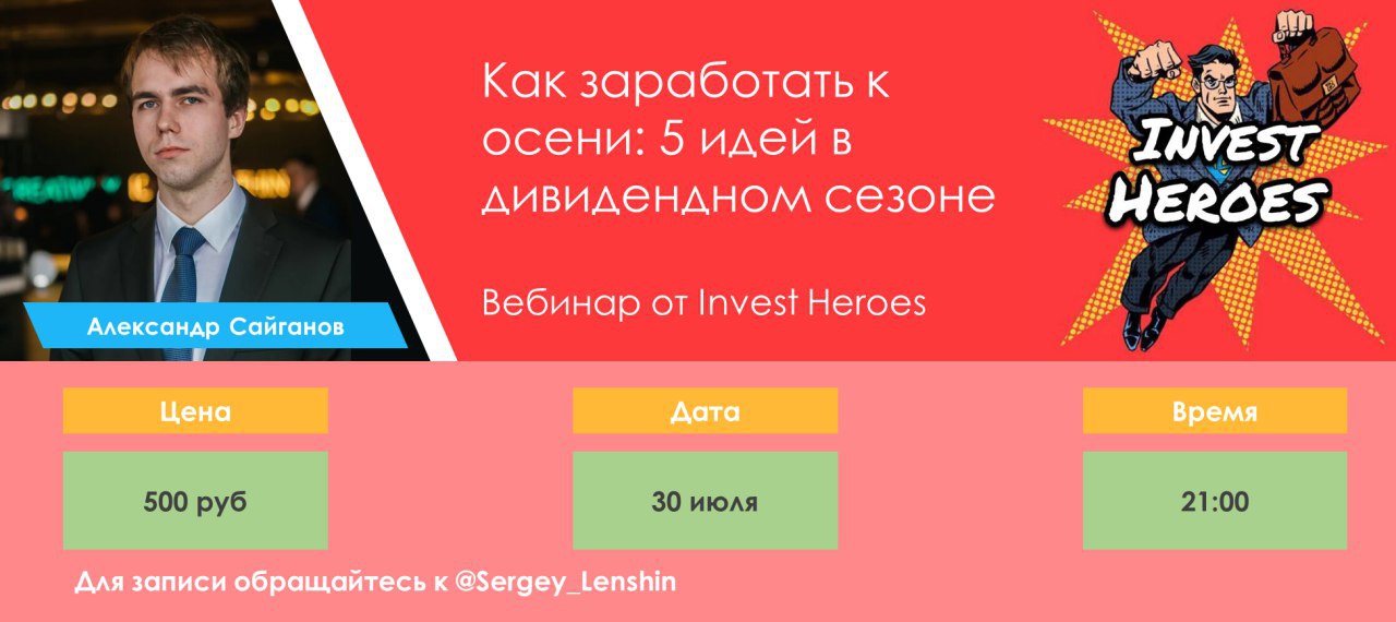 Сегодня пройдет вебинар по инвестидеям на осенний дивсезон. Те, кто ещё не записался, может посмотреть детали здесь / стоимость 500 руб.