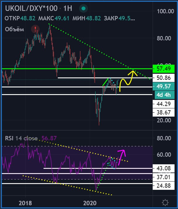 Ещё 1 фактор - это слабый доллар (DXY - индекс доллара). Мой индикатор показал перспективную формацию по нефти с поправкой на DXY ещё 10 ноября при нефти по $42 BRENT.