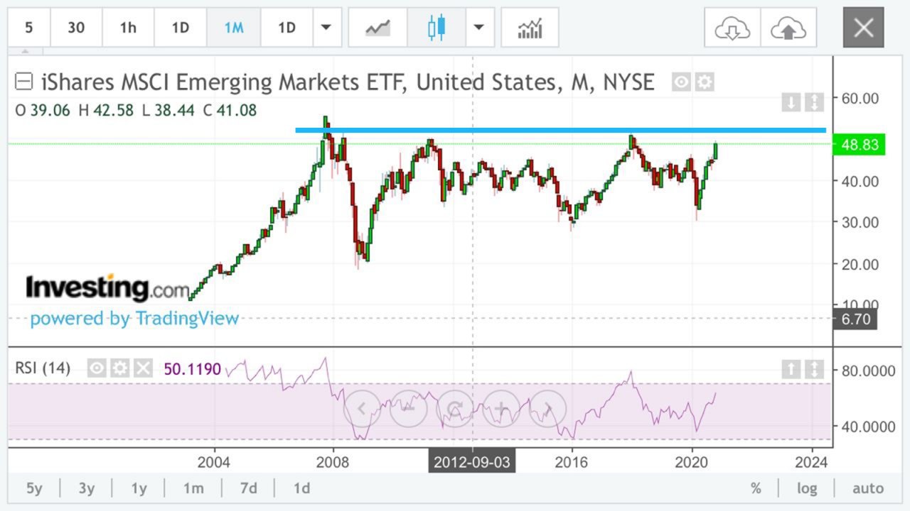 📈 Для того, чтобы отслеживать движение, я смотрю сейчас на ETF на развивающиеся страны - он как раз подходит к пику, а индекс РТС к отметке 1300 пунктов (см. ниже) - эти индикаторы дают нам потенциал роста 3-4% в долларах до пика приблизительно