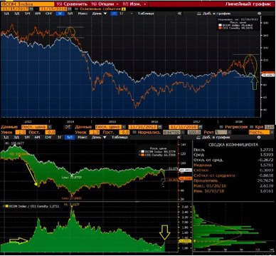 Отношение индекса BCOM к стоимости нефти Brent на текущий момент достигло уровня 1.2-1.3, который был в сентябре 2014 года перед крутым падением… Дальнейший рост этого коэффициента будет сопровождаться, скорее всего, более быстрым падением цен на нефть, что может стать предвестником нового кризиса.
