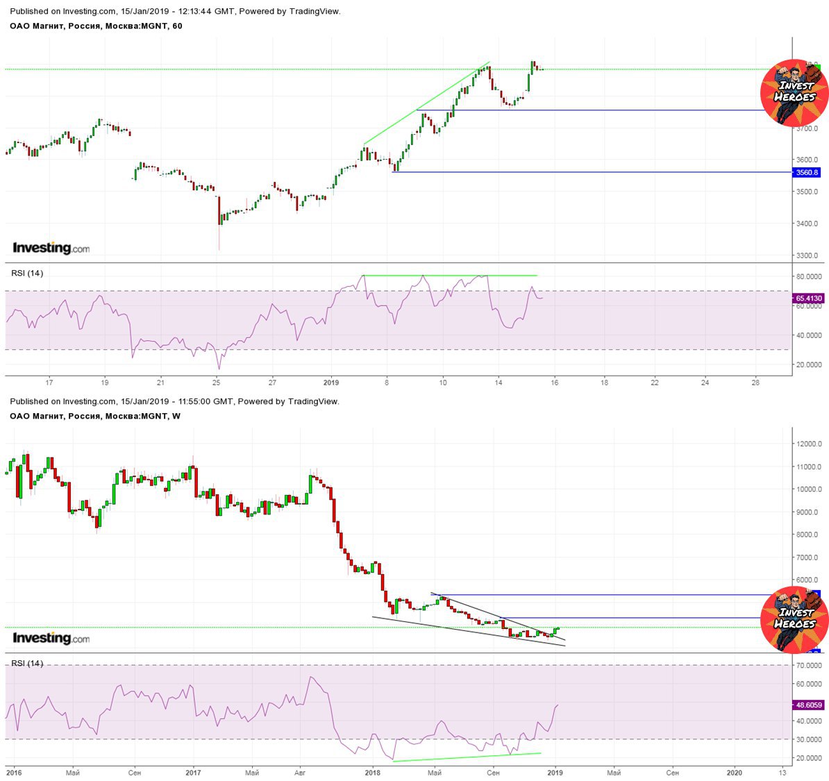 На недельном графике акции приняли форму клина и предприняли попытку выхода из него. При росте рынка могут вырасти выше рынка до уровней сопротивления: 4315 или 5330.