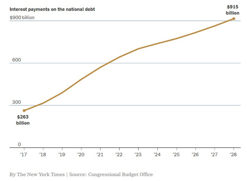 - стоимость обслуживания долга в 2018 уже составила $371 млрд., растет ее доля в бюджете