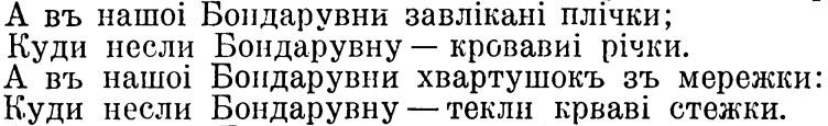 Вот, например, довольно мрачная - и сюжетом, и отсутствием контекста - песня "Як засватав Куземучко у Черниша дочку". Некто Куземучко заехал на ужин к тёще, а некие Одарка и Малашка увидели его в окно и бросились точить топор, после чего скомандовали Куземучке встать из-за стола, посадили в сани и вывезли в лес. Непонятно, в каких отношениях состояли между собой эти трое; но в балладах убийца - часто обманутая девушка, так что их мотивы можно додумать. Заканчивается драма словами: