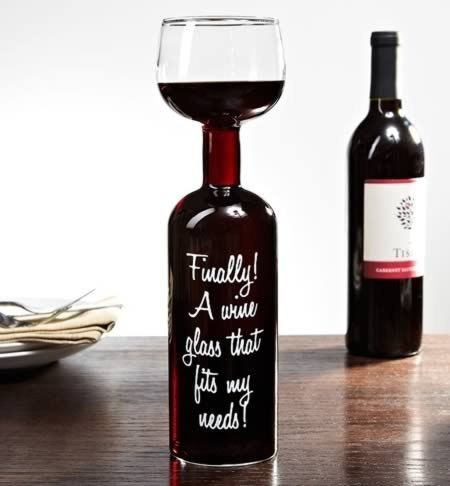 ​​Этот бокал для вина в виде бутылки, высота которого равна 29 сантиметрам, вмещает 750 миллилитров жидкости, а также стержень подачи вина в бокал. На бокале написано: «Ну, наконец-то! Бокал для вина, который соответствует моим потребностям!».