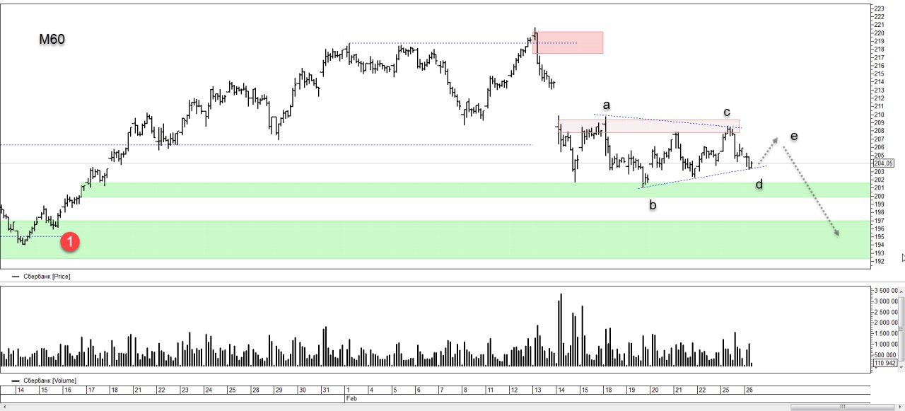 Хоть ситуация и усложнилась и предъидущий план не очень хочет отрабатывать (https://t.me/TerritoryofTrading/1040), есть другой. С тем же направлением, но несколько иначе. Текущие зигзаги в данный момент отчетливо рисуют треугольник abcde. Ожидаю выход вниз ориентировочно до 195 и возобновление в диапазон покупок 2.