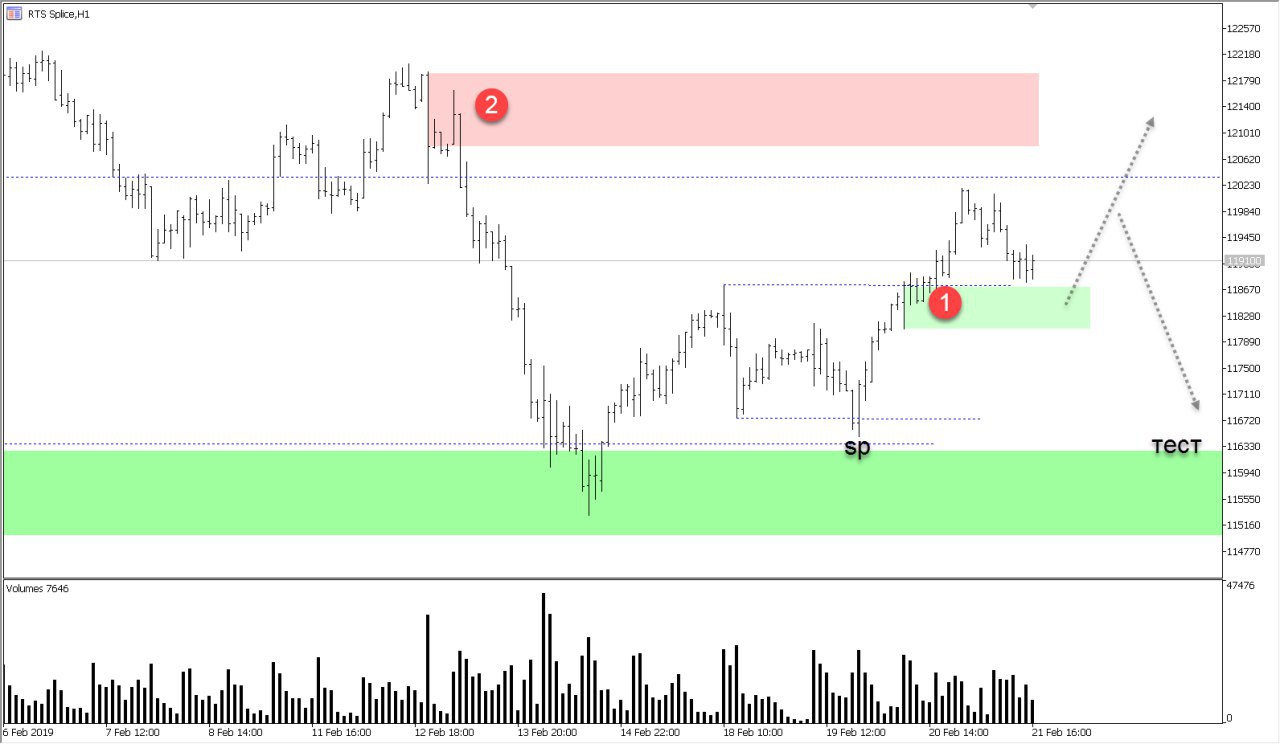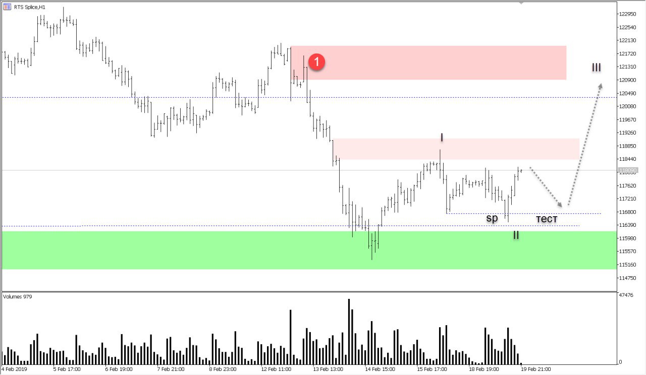 В моменте, из диапазона 1 ожидаю возобновление покупок. По характеру направления выделяю два возможных варианта. В случае активных покупок, проход в диапазон продаж 2. В случае плохого возобновления, ожидаю тест линии sp.