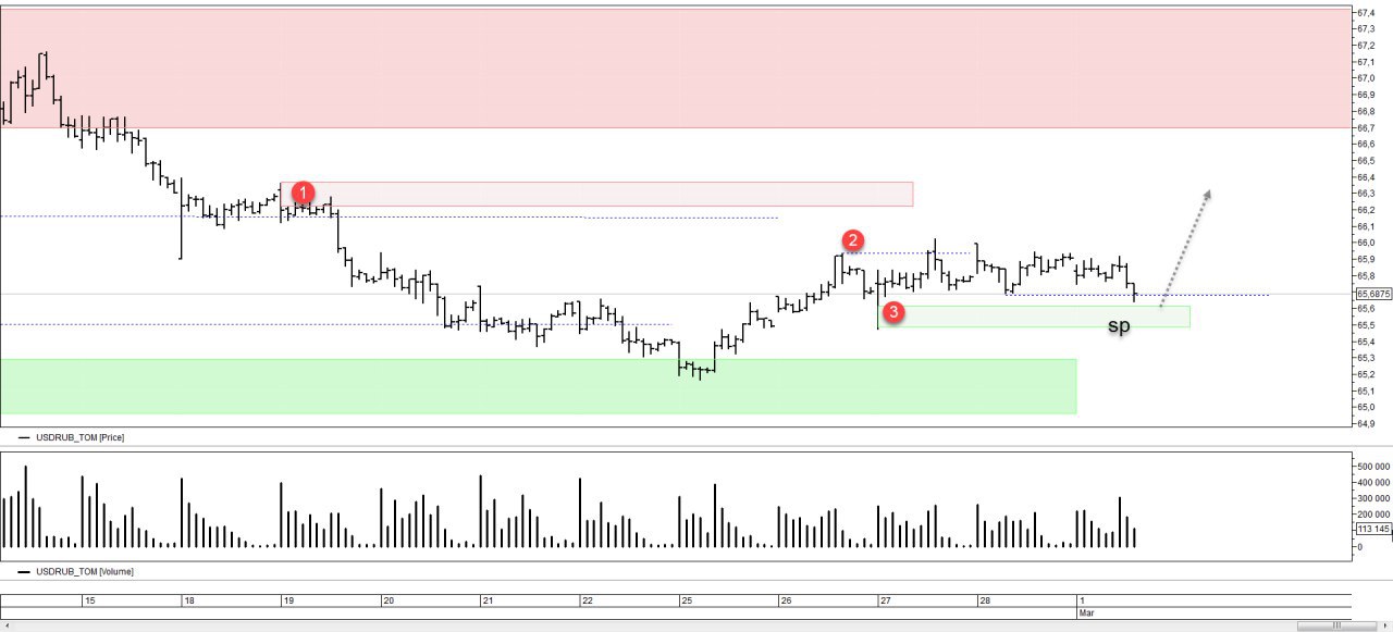 Продолжу развивать прошлые соображения. Цена достигла диапазона 1 и сегодняшний день характерен слабыми продажами. Ожидаю продолжение роста.