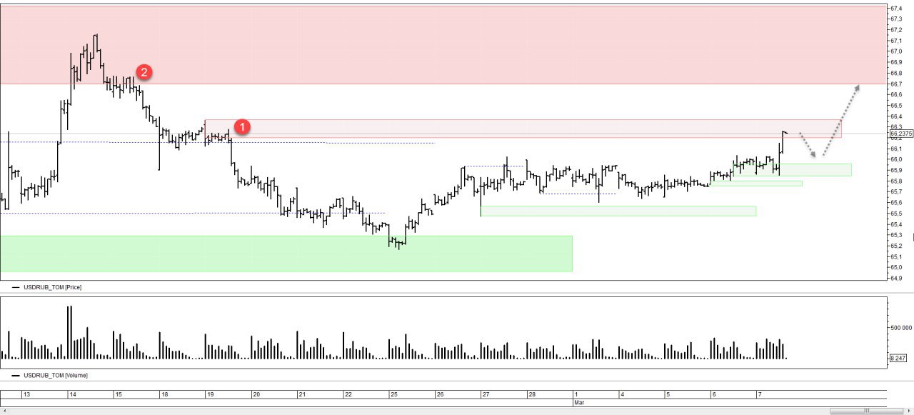 Покупатель, которого ждал из диапазона, не вывез. По факту цену вернули к покупателю в диапазоне 1. Ожидаю покупки до диапазона продаж 2. Там внимательно нужно проконтролировать силу продаж. В случае слабых медведей, ожидаю пробой 66,3. В случае сильный медведей, ожидаю возобновление движения по старшему тренду.