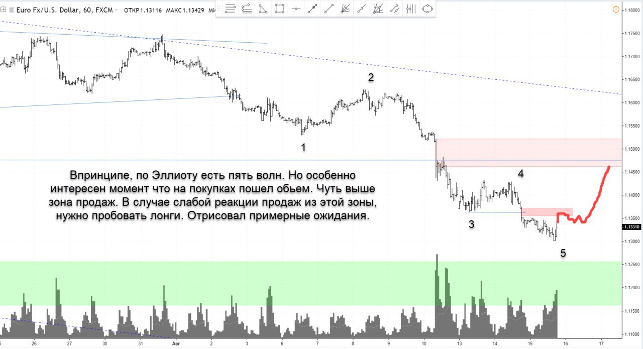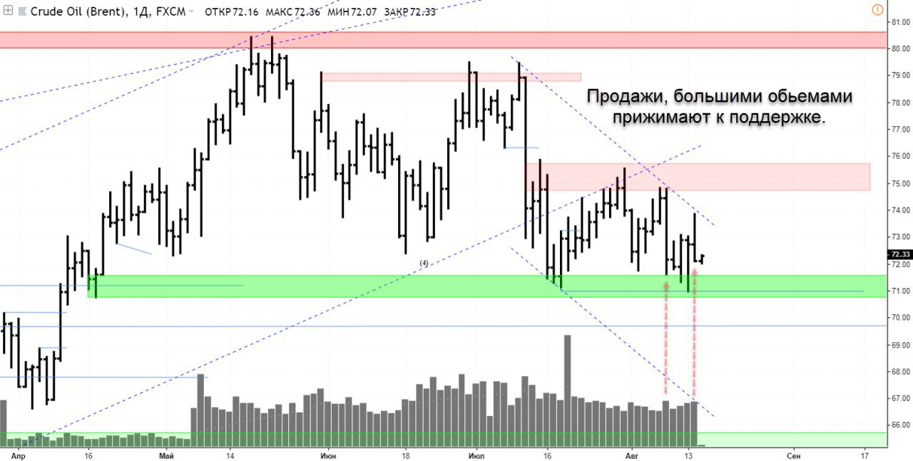 Фактически идёт завершение нисходящего тренда. Теперь просто нужно отследить объемы. Продажи стихают, но пока идут. Нужно дождаться полной остановки.