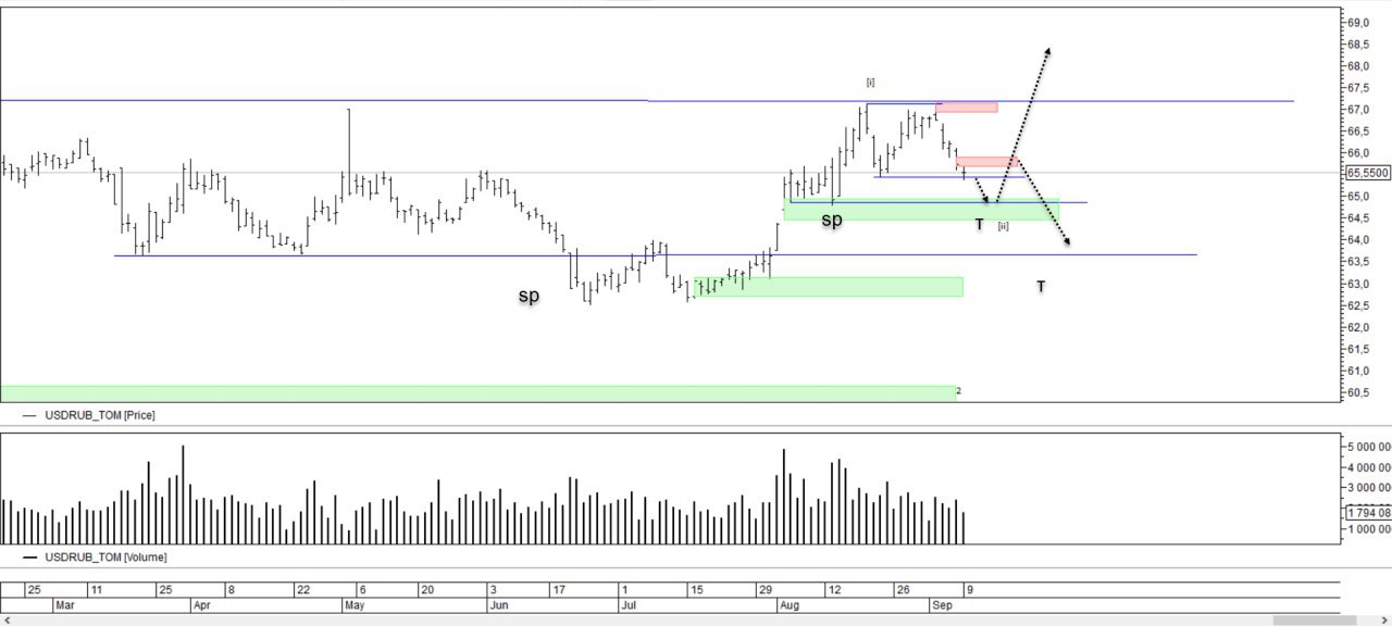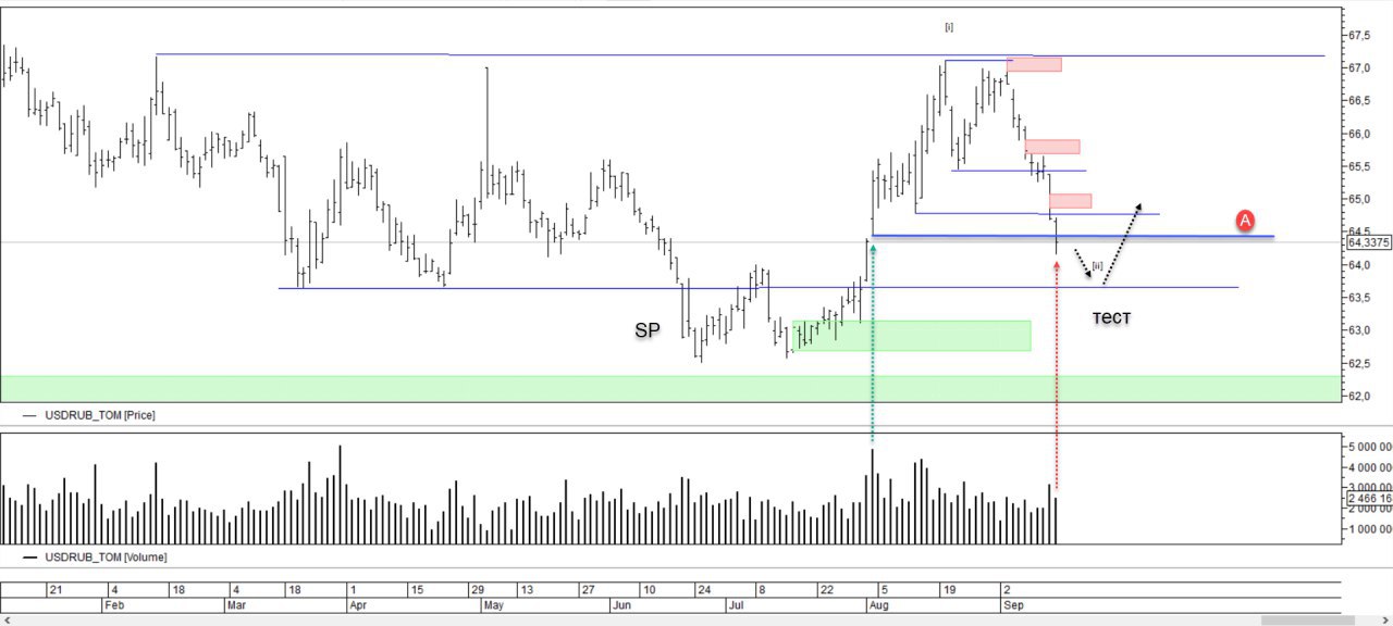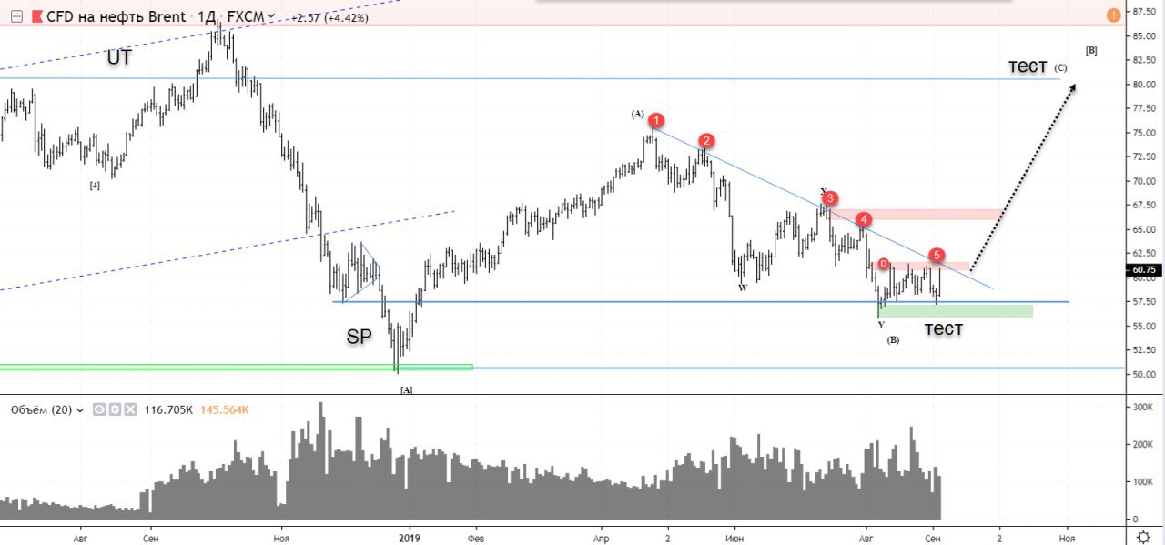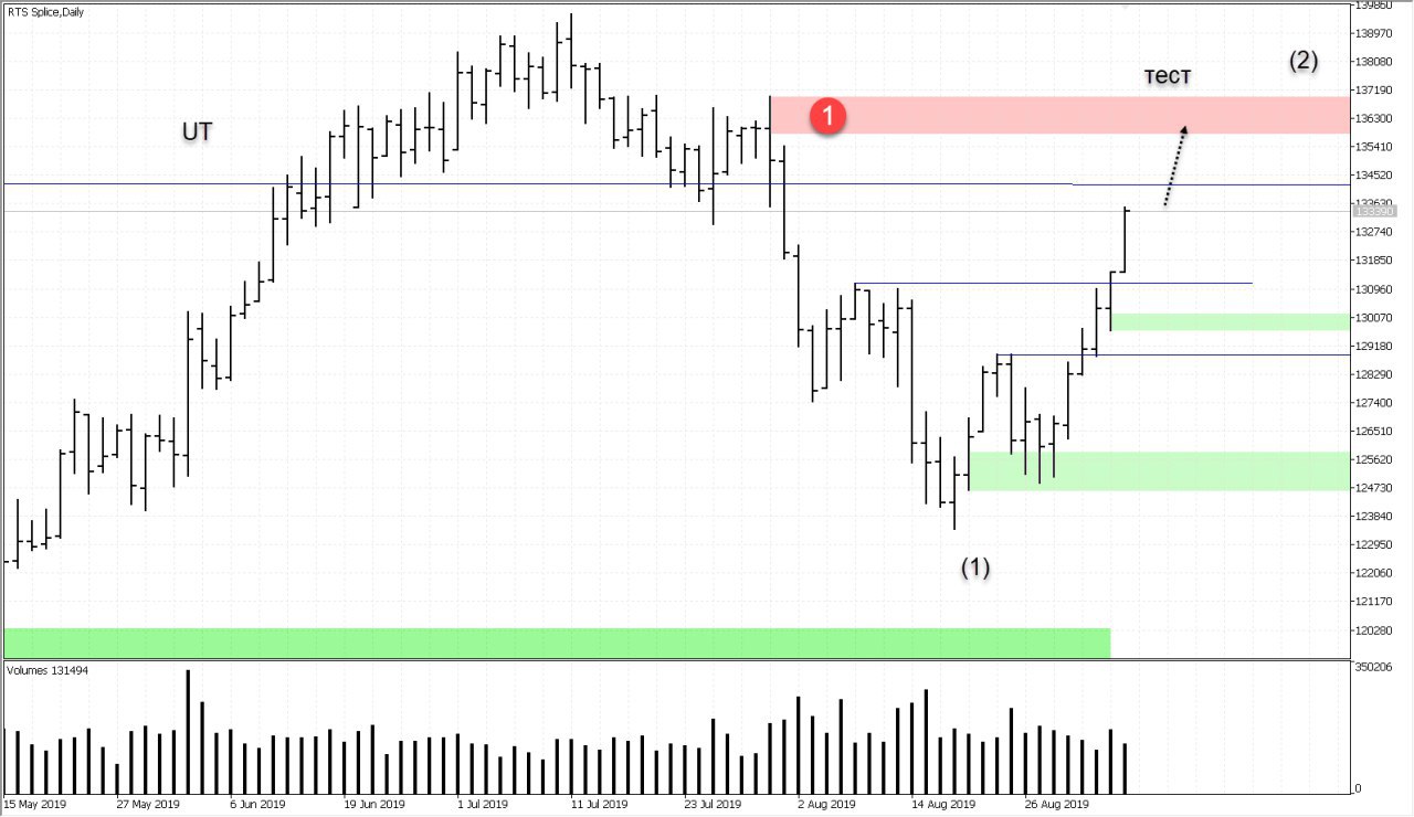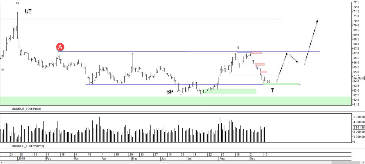 Цена в упор подходит к цели, в зону покупок A к тесту ut. Вполне разумно ожидать реакции, но ситуация может быть двусторонней, о которой говорил в прошлый раз.