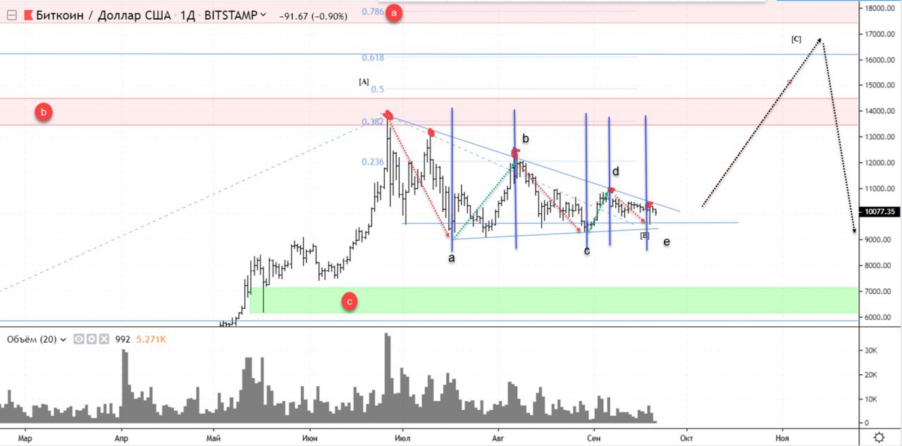 Было два сценария. Либо уход в большой ренж, либо в третью волну. Более реальным становится уход в ренж. Причиной оказался треугольник и дальнейший выход из него. Ожидал тестирование диапазона с, но с течением времени выяснилось что идет накопление. Скорость продаж явно хуже скорости покупок. Линия тренда продавцов намного сильнее ослабленна чем у покупателей. Полагаю сформированна волна e. Ожидаю проход к диапазону a, в рамках волны С и затем снова возврат к нижнему диапазону треугольника. Дальше посмотрим.