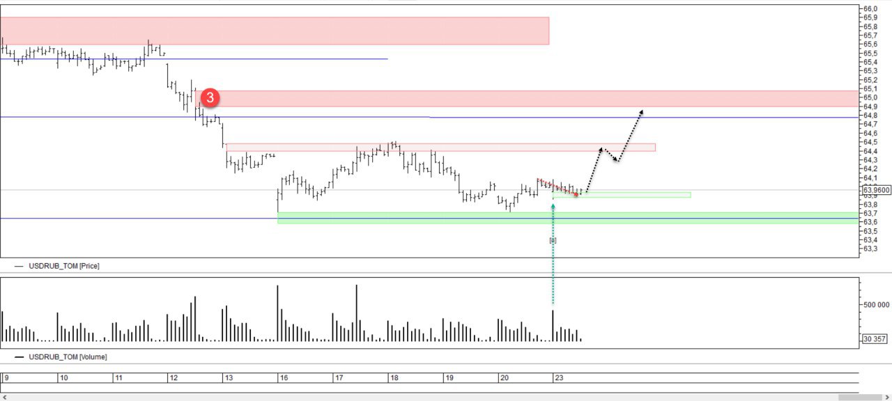 Цена пока идет по плану, слегка обновив минимум. Ожидаю реакции из зоны. В случае ее слабости движение продолжится к диапазону 3. Работаю по старшим планам.