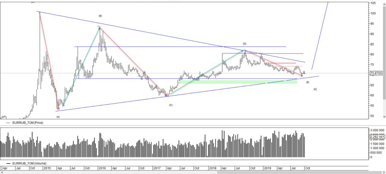По причена отката глубже чем ожидалось, глобальная разметка изменила суть структуры. Настолько глубокий откат визуально ставит под сомнение серию первых волн. Очертания больше принимают форму зигзага (w)(x)(x). Это говорит о многолетнем ренже, но и в нем есть где порыбачить. В данный момент цена в диапазоне покупок A. Вероятен спринг. При этом волна (x) напоминает форму плоскости. Возможно что именно отсюда начнется подволна а, зигзага (y).