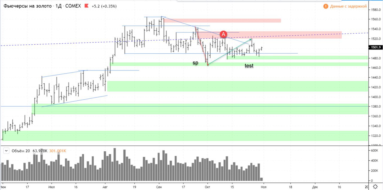 Цена подошла к диапазону продаж B, в целом образован sp. Любопытный факт в том, что после резкого пролива на объеме, реакция последовала вверх, что говорит о выкупе. Есть все шансы уйти по локальному плану ну и в целом настроиться на глобальный.