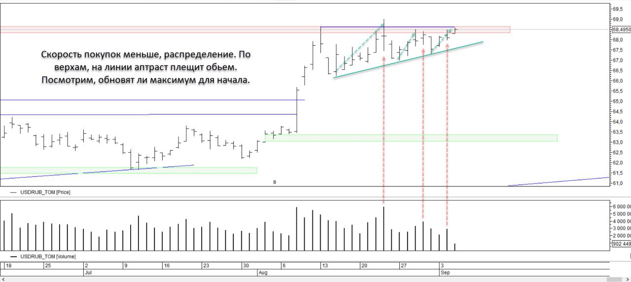 Цель хорошая для лонга. Но, прежде чем брать, нужно проверить пробой. Важно качество. Качество определяется по слабым продажам.