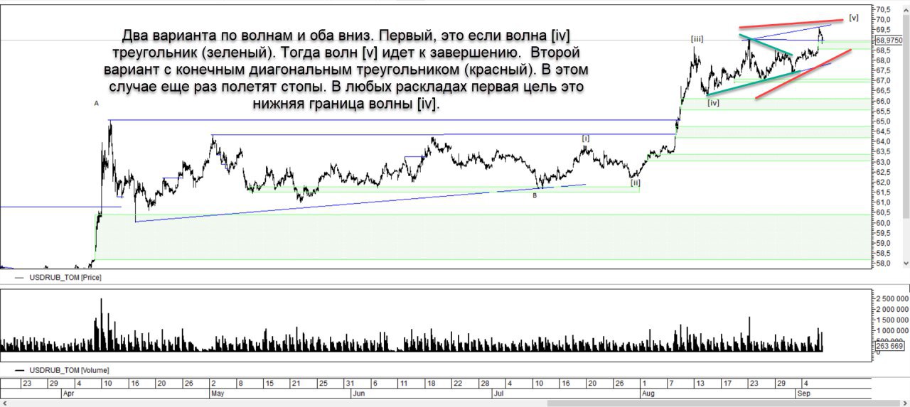 Так вот, вся борьба в зоне продаж. Скорость продаж выше. Как следствие, распределение. А теперь по Эллиоту. Все движения тройками в пятой волне. Есть два варианта развития событий на скриншоте. Какая бы шумиха не была вокруг рубля, курс держу тот же. 20ого экспирация на фьюче. Скорее всего, в этом тоже есть взаимосвязь.