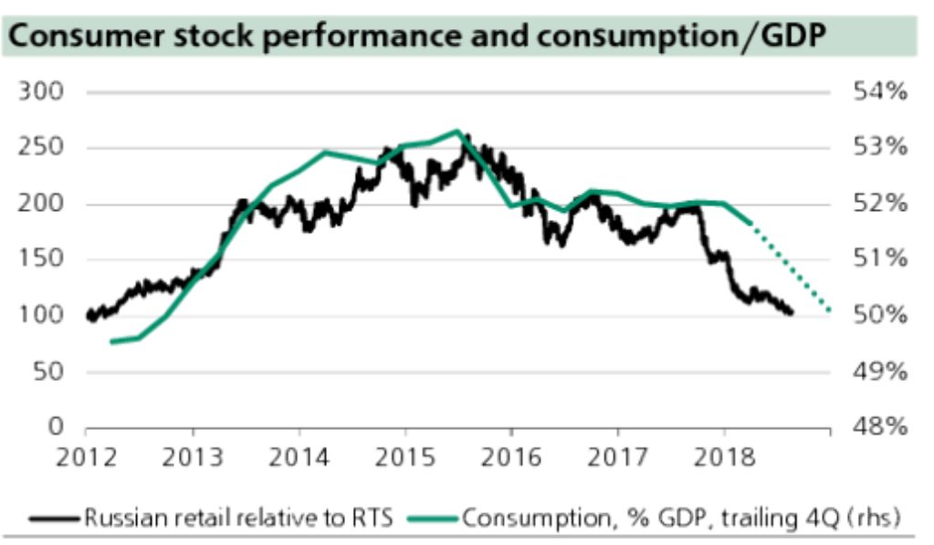 ​​Динамика акций ритейл компании к индексу РТС и соотношение потребления к ВВП. Наблюдается четкая положительная корреляция. Учитывая текущую динамику акций ритейл компании можно предложить что доля потребления к ВВП снизится до 50%. #ru #macro