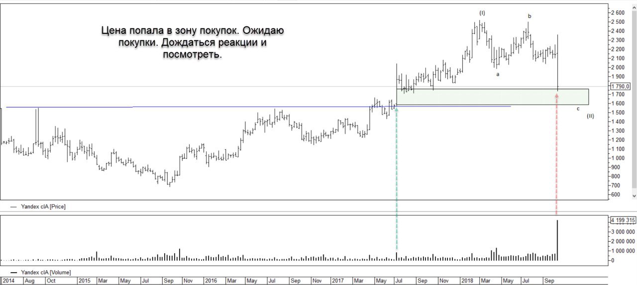 Сколько шума по поводу выкупа Яндекс Сбербанком. Послетали все кто стоял в лонгах. Но давай разберемся. Давно не было коррекции. Она пошла в рамках волны (II). Это нормально. Вопрос, где купить? Цена попала в уровень покупок, в диапазон бара на котором прорывали сопротивление. По сути отсюда ждать покупки. Единственное, вытянут ли быки. Но если посмотреть на часовики, можно заметить что объем прошел по низам, то есть выкуп.