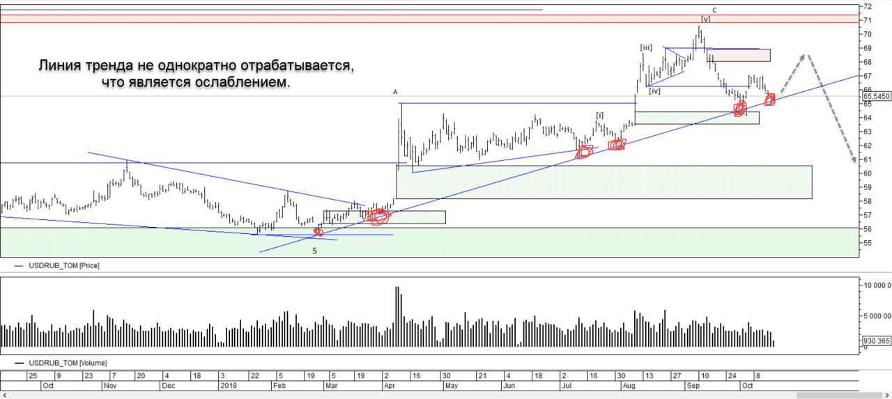 И вот что хотел показать. Тренд довольно слаб, это говорит о том что его будут ломать. Ну и полагаю что после 68-69 цена устремится до 58-60 руб. Ранее об этом уже рассуждал 👉https://t.me/TerritoryofTrading/335