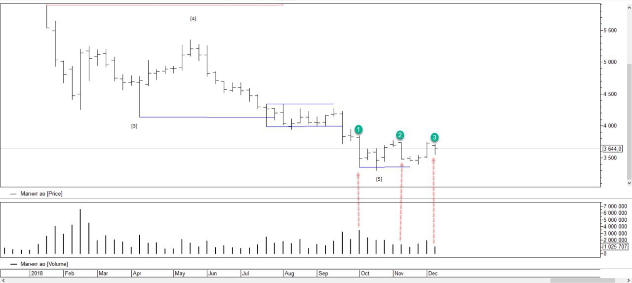 4) Минимум 1 был пробит более слабым объемом, это говорит о том что цена далеко не пойдет.