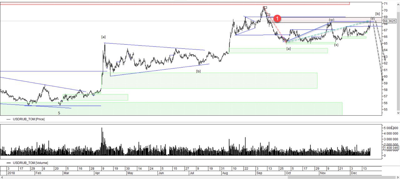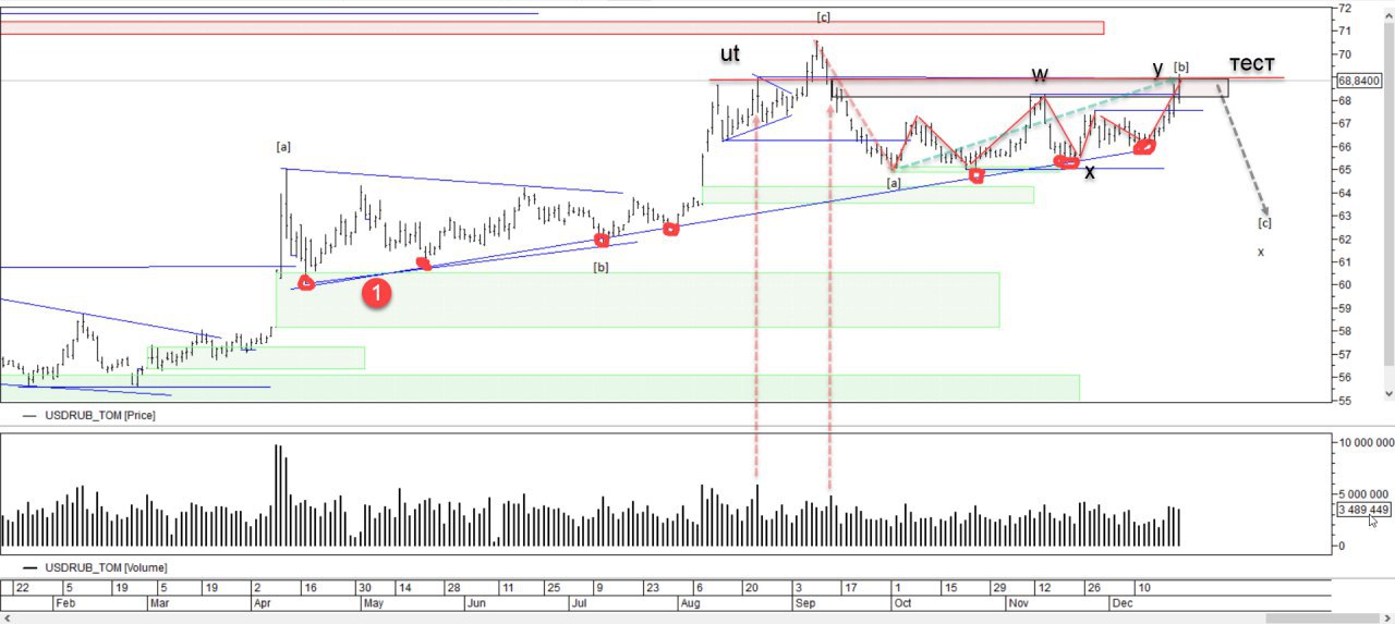 Картинка сложилась. Волна b приняла форму двойного зигзага (wxy). Второй момент это скорость. Волна a прошла импульсивней и быстрей волны b. И в моменте цена уперлась в зону продаж 1. Получается, что коррекция подошла к концу. Ожидаю волну c с целью 62 примерно или 59. 59 конечно мало вероятно.