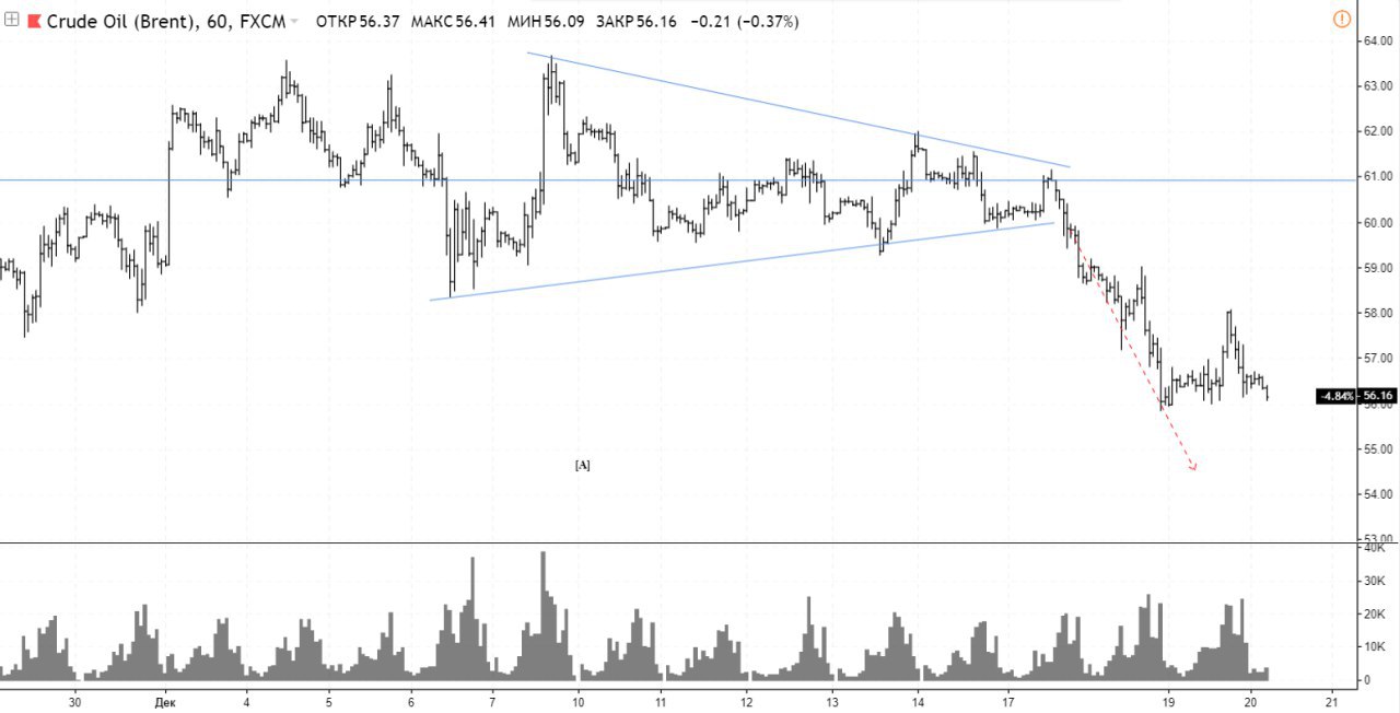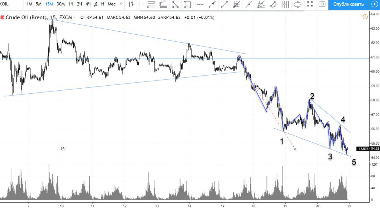 Есть такая модель в пятой волне по Эллиоту, на зывается конечный диагональный треугольник. Признак резкого разворота. По сути четвертая у нас была в формате треугольника и пятая добила высоту треугольника в формате кдт. Что ж посмотрим.