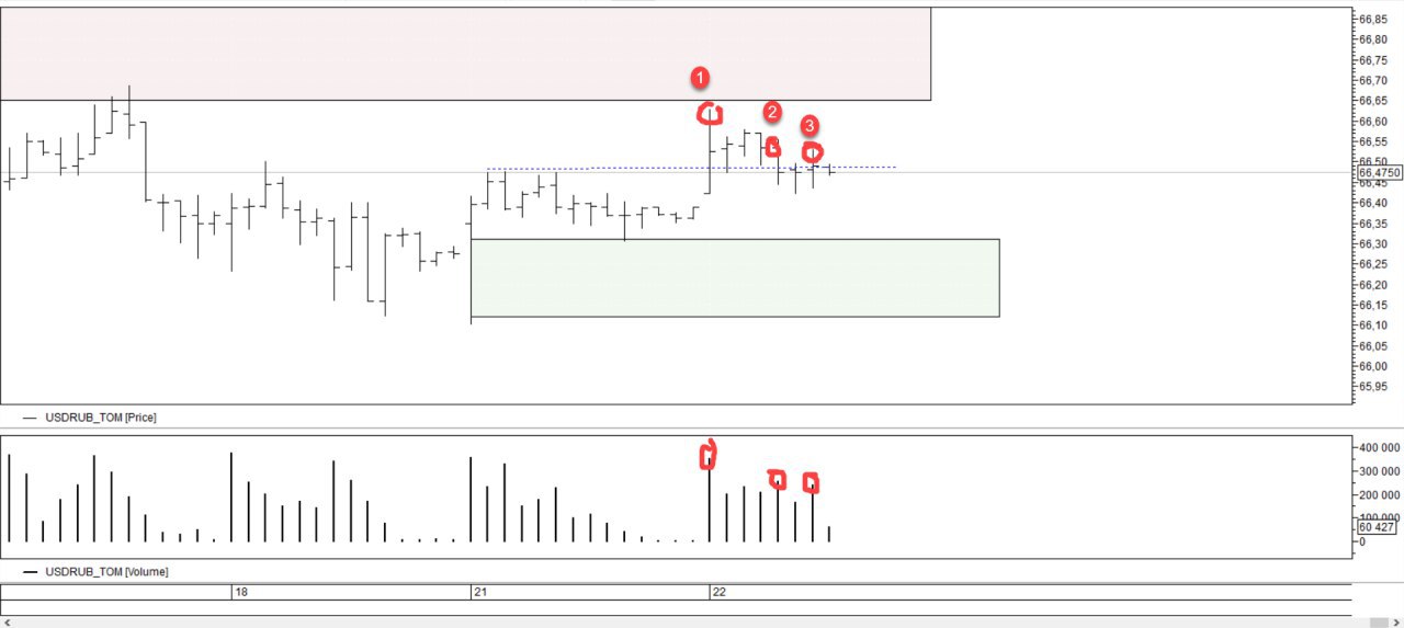Попробую разобрать текущую ситуацию. По эллиоту в моменте сложно что либо сказать. Так что посмотрим по vsa. Цена неоднократно тестирует линию сопротивления, что является ее ослаблением. Последовательно в точках 1, 2, 3 возобновление продаж заметно стихает. Скорость продаж хуже покупок, накопление. В данной ситуации не ясно как всех разбросают. Самый идеальный вариант, не лезть вперед паровоза, а дождаться пробой. И если продажи будут слабы, то можно купить в точке А. Как только дождусь это ситуации, оценю цели.