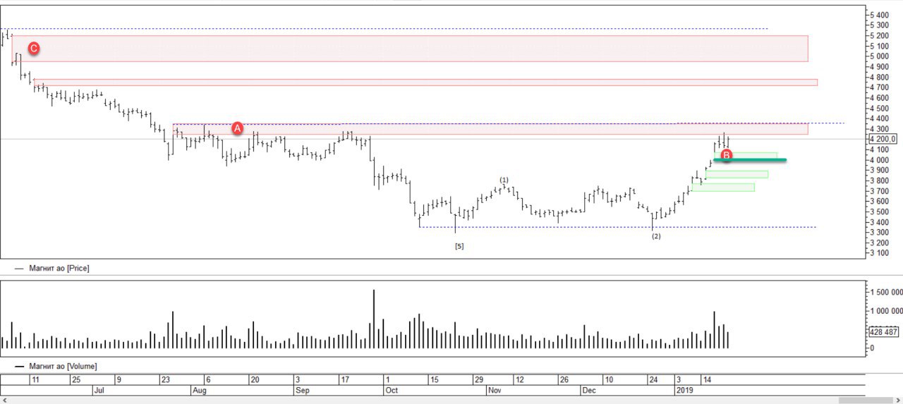 Дальше скрин. Промежуточные уровни A, B и С. Хотя А может быть достаточно серьезным. На нем была манипуляция. В любом случае, ожидаю проход к диапазону А, от туда возможны мощные продажи на коррекцию. B и C можно изпользовать для докупки.