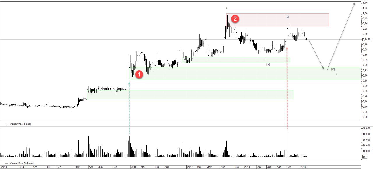 Бумага перспективна, но всему свое время. Нужна корректировка. Полагаю в моменте формируется волна II в формате зигзага [A][B][C]. Причина такого суждения, всплеск большого объема из зоны продаж 2. Целью окончания коррекции может выступить диапазон 1. После которой ожидаю движение в рамках волны III.