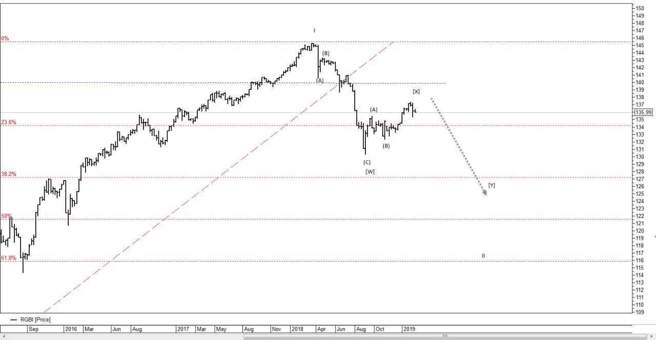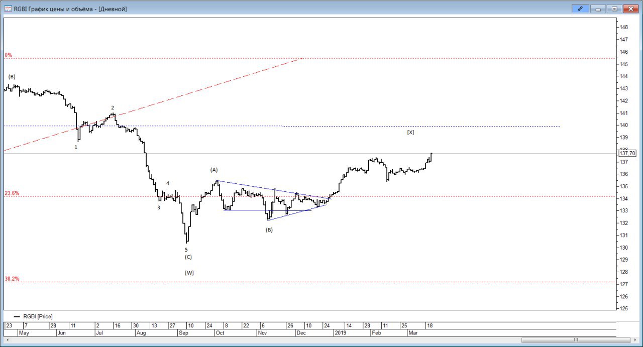 Пора переходить к большему масштабу и готовиться к будущему снижению. В Целом движение вниз идет в формате двойного зигзага WXY. В моменте подходит к завершению волна X.