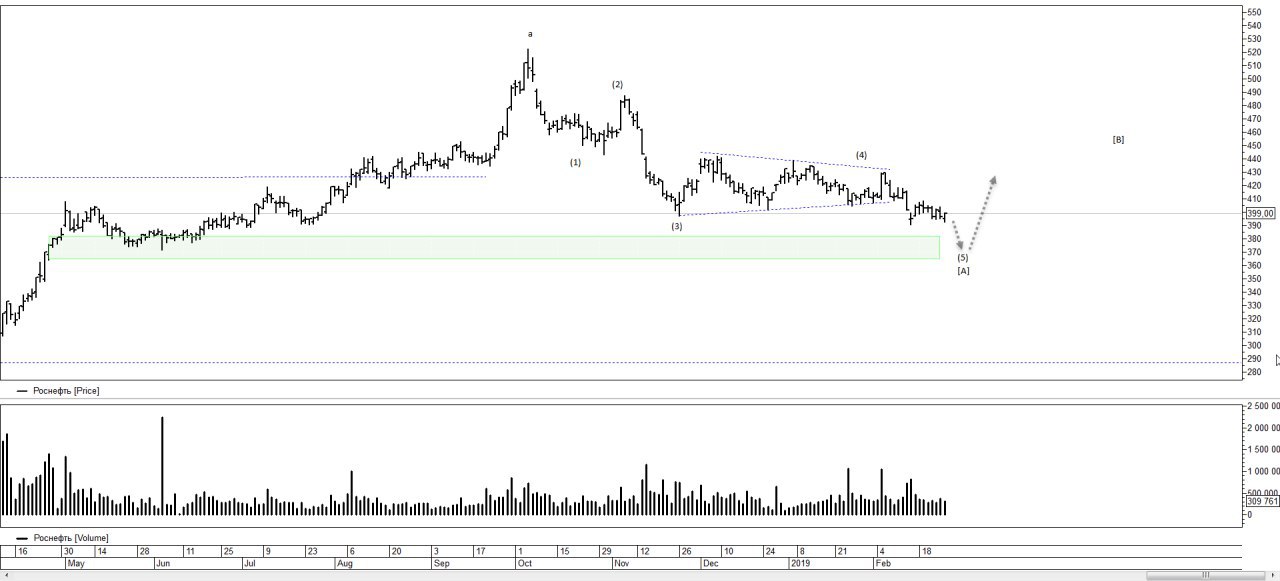 По Эллиоту все текущее снижение похоже на пятиволновый импульс с треугольником в волне 4. В этом случае после завершения треугольника ожидается выход вниз с целью в диапазоне 2. Тогда и завершится волна (А).