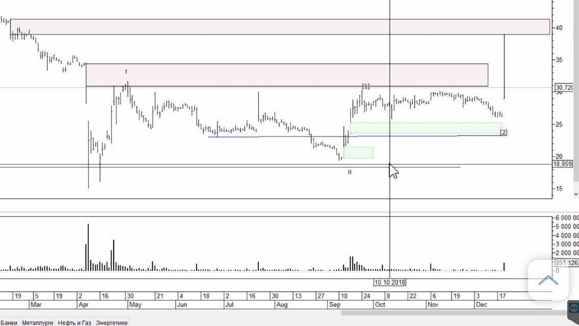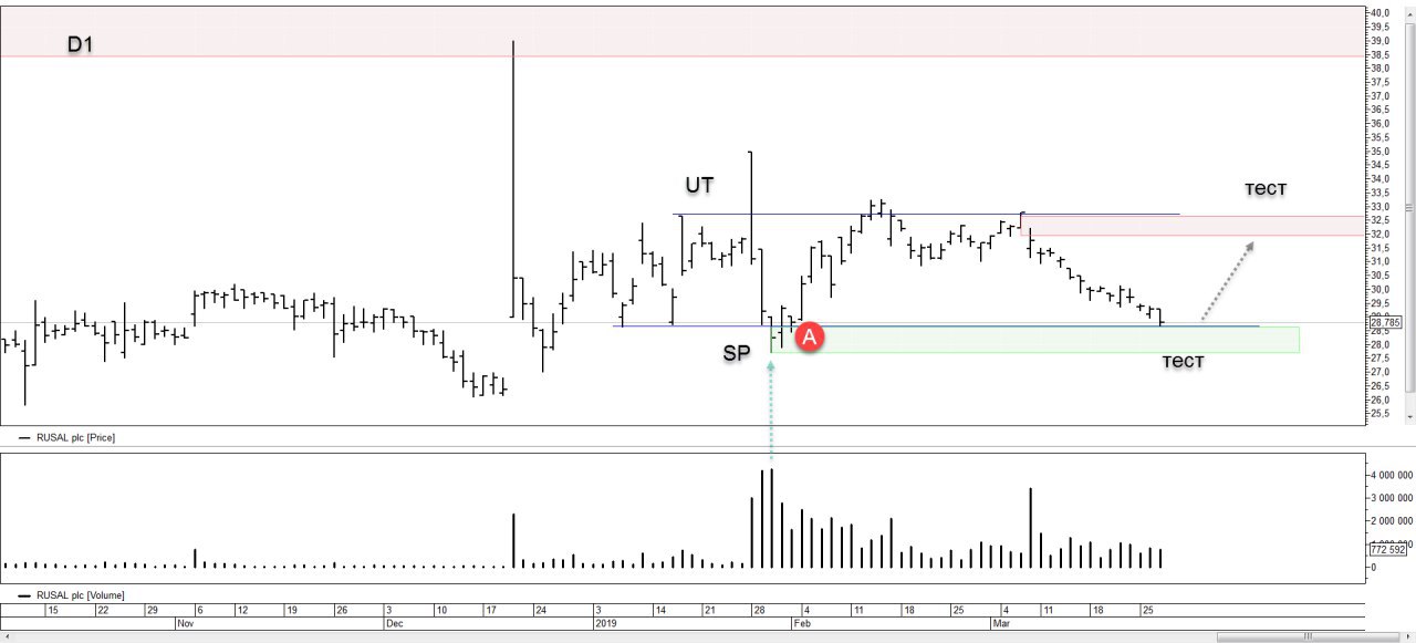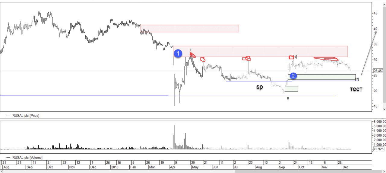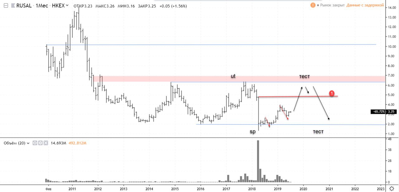 Наконец месяц как растет с разворотной точки. Но я бы хотел рассмотреть перспективы в целом. Поскольку на нашей бирже история достаточно короткая, посмотрю на Гонконгской бирже. График месячный. Апрель характерен огромным объемом, на реакцию которого шли слабые продажи. Это говорит о выкупе актива. В случае отсутствия продаж до диапазона 1, ожидаю тест ut. Очень любопытно как медведи начнут возобновлять продажи. По их силе можно будет сделать дальнейшие выводы, но есть все шансы затестить sp. Но все это развиваться будет очень долго.