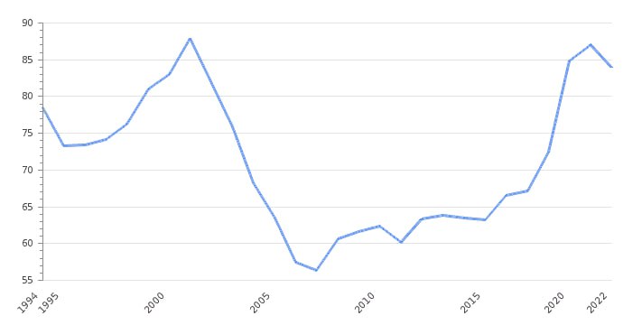 На графике показано отношение долга Пакистана к ВВП. В целом высоковато, но в 2000-е было примерно таким же и тогда никто особо о дефолте не вспоминал.
