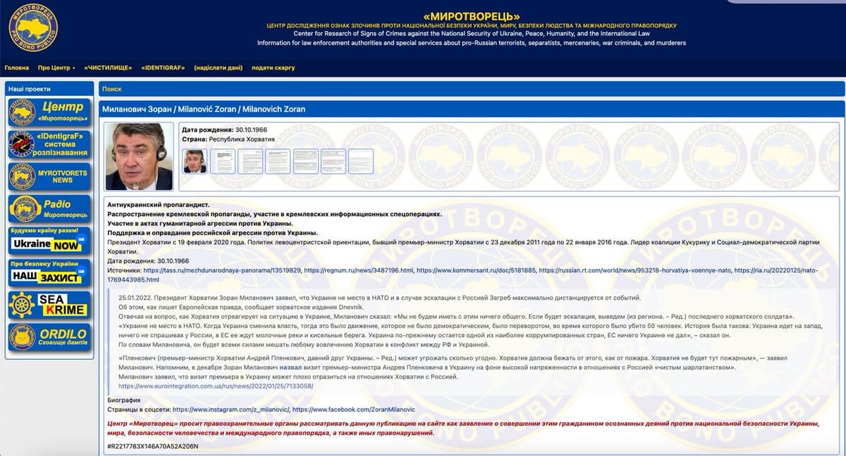 В общем, такой себе хорватской Шенбах на максималках. За что моментально был зачислен на "Миротворец". МИД Украины уже целую истерику закатил, с требованием извинений за "неправильную позицию".