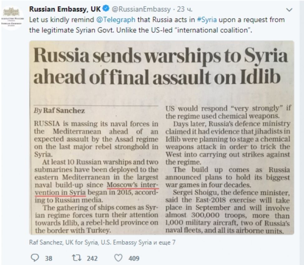 «Давайте любезно напомним The Telegraph, что Россия действует в Сирии по просьбе законного сирийского правительства. В отличие от возглавляемой США “международной коалиции”», – пишут российские дипломаты.