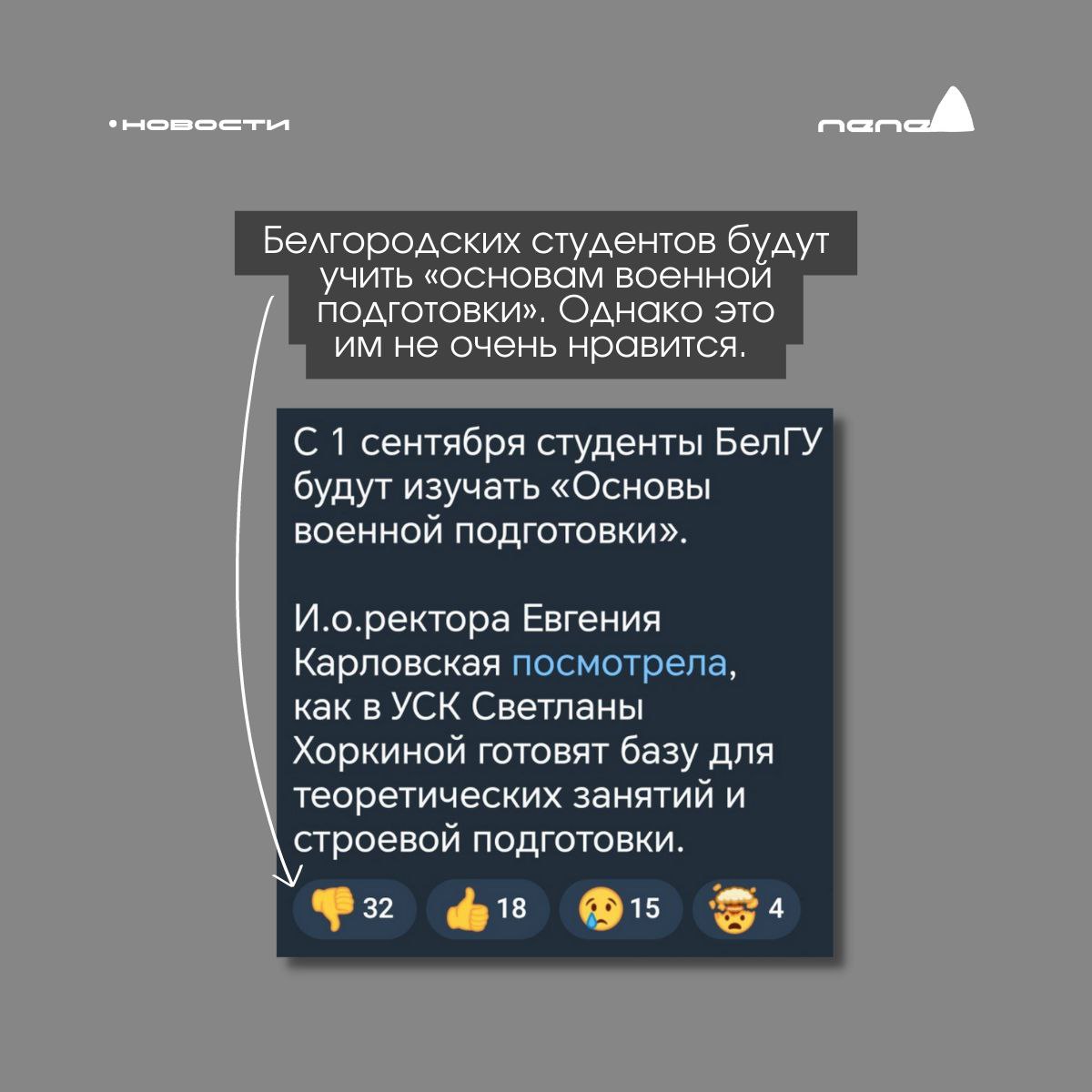 В БелГУ уже подготовили кабинеты для занятий по военной и строевой подготовке. Однако, судя по дизлайкам под постом с этой новостью в официальном канале университета, студентам эта инициатива не очень нравится.