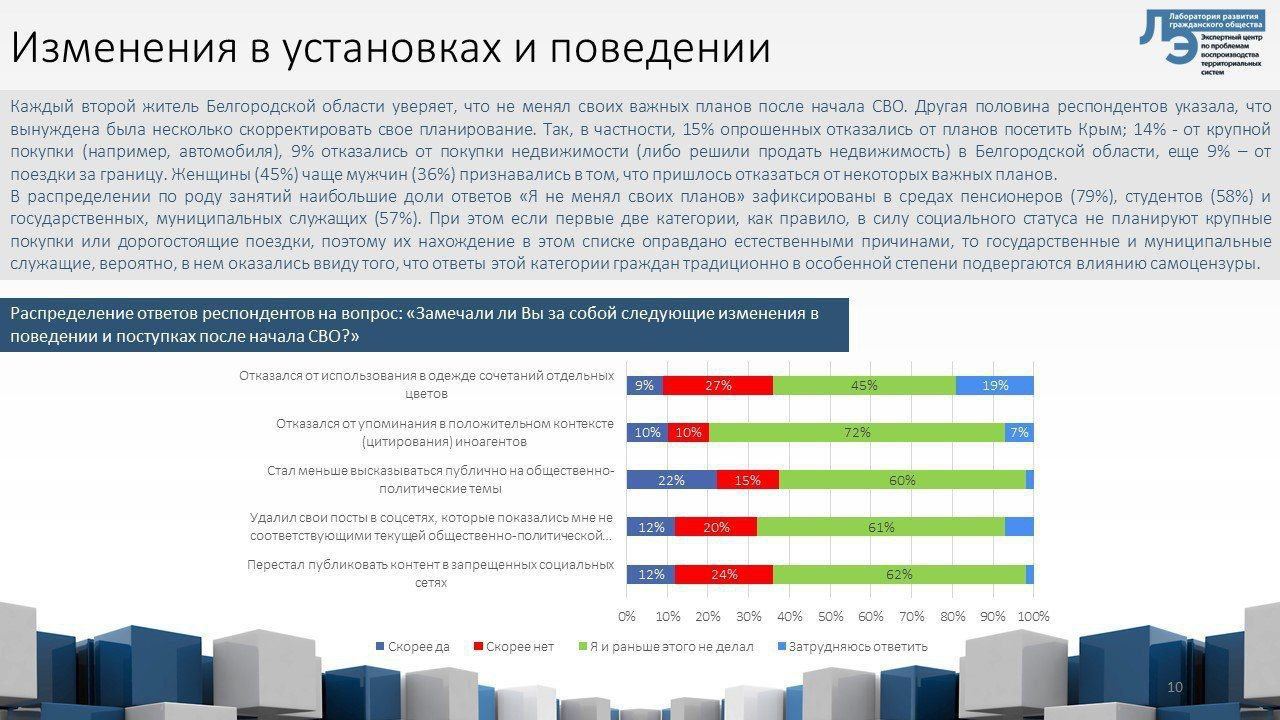 — Можно констатировать, что после начала СВО в практиках самопрезентации и личных медиакоммуникаций произошли определенные изменения, связанные с самоцензурой по этическим мотивам и в связи с влиянием административно-политических регуляторов. Данные изменения затронули от 10% до 20% социума Белгородской области, но их масштаб, вероятно, несколько больше из-за латентного характера процесса самоцензуры, — говорится в исследовании.