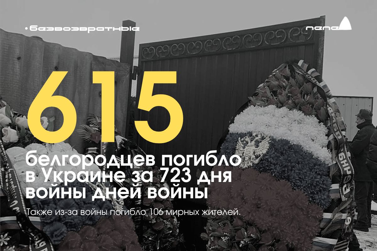 За 723 дня войны в Украине погибло как минимум 615 военнослужащих и 106 мирных граждан из Белгородской области. Ещё 35 военных — пропали без вести.