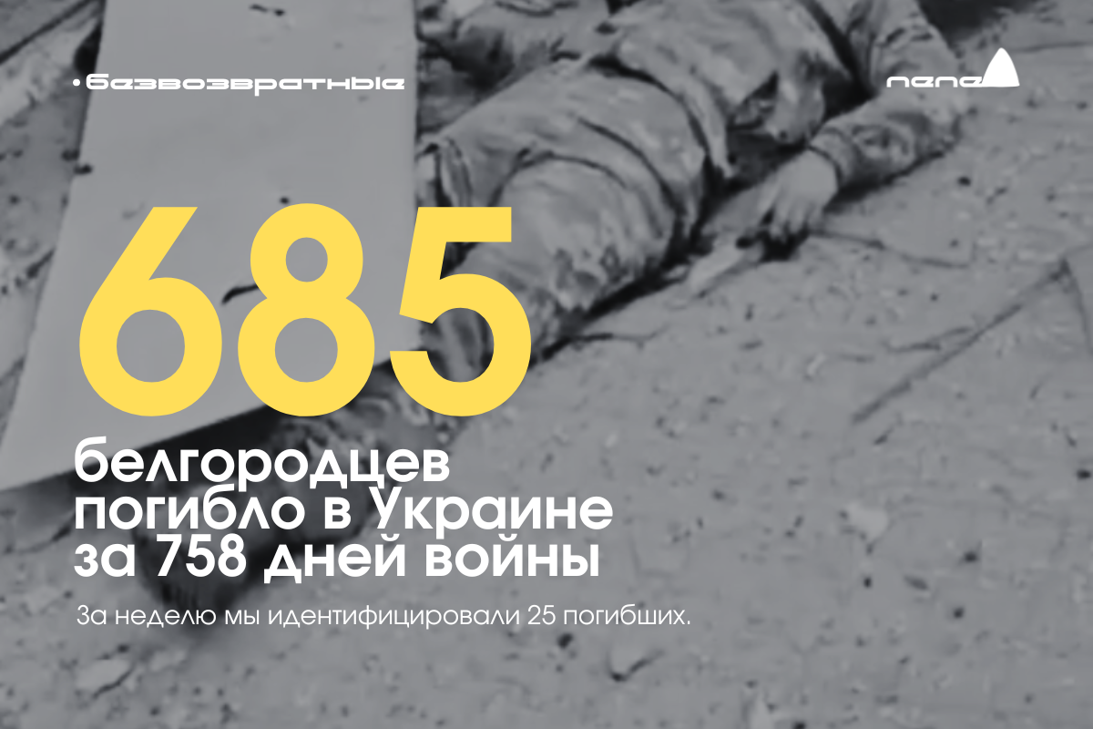 За 758 дней войны в Украине погибло как минимум 685 и пропал без вести как минимум 41 военнослужащий из Белгородской области, а также погиб 131 мирный гражданин.