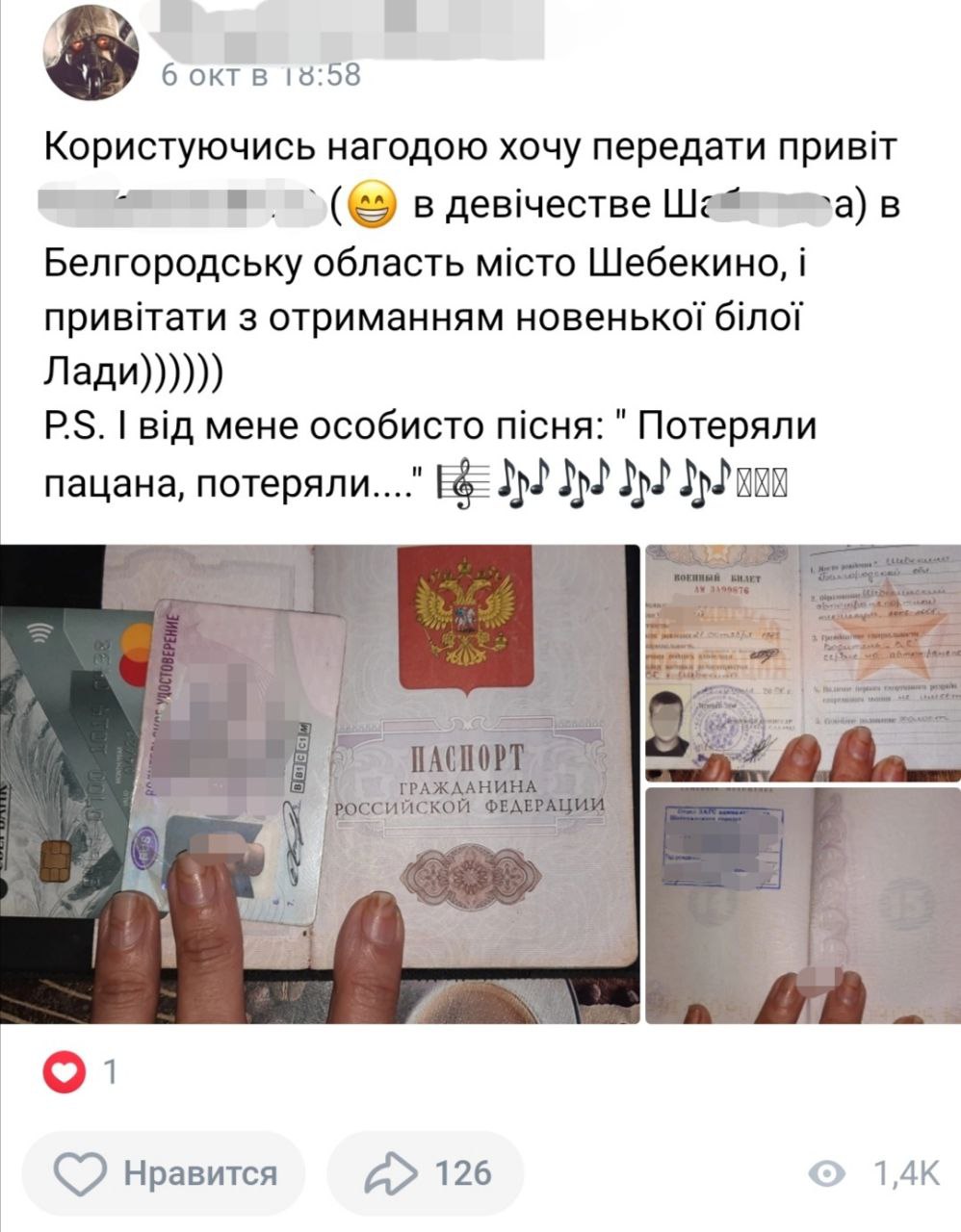 Его документы опубликовал один из украинских аккаунтов. В сообщении жену мобилизованного поздравляют с получением белой лады, намекая, что её муж погиб.