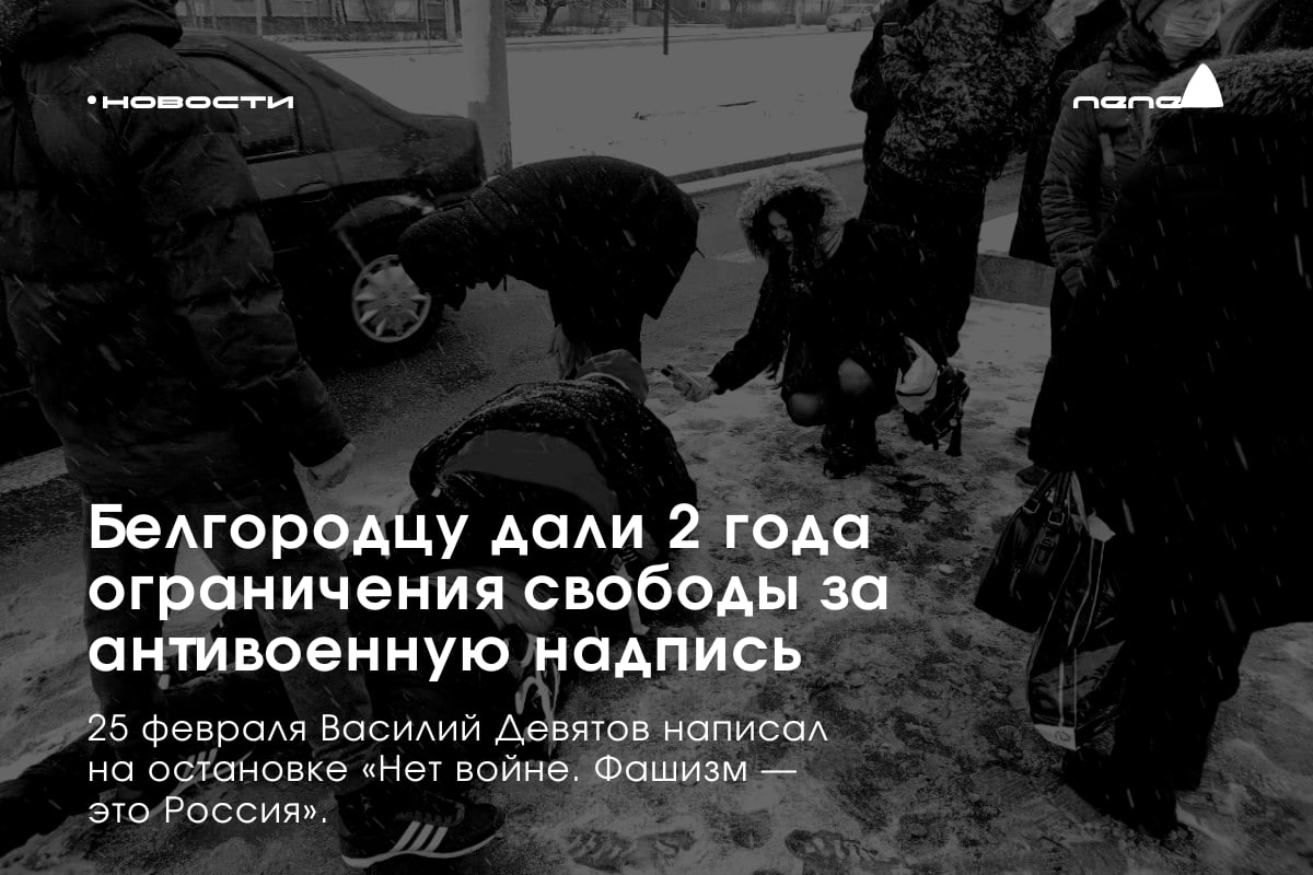 Белгородцу Василию Девятову назначили два года ограничения свободы за надпись «Нет войне. Фашизм — это Россия», которую он оставил 25 февраля на остановке «Водстрой».
