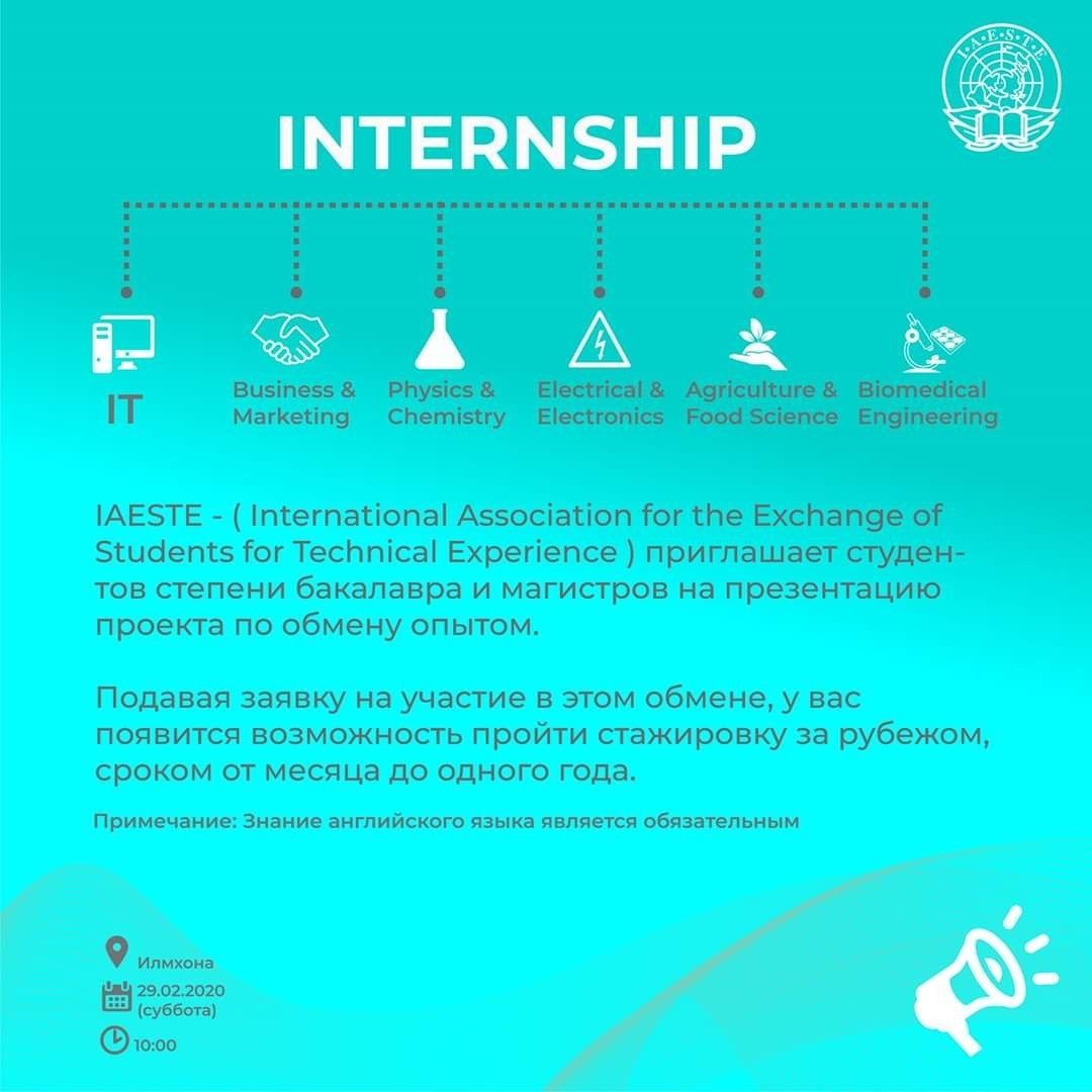 Возможность для всех студентов степени бакалавра и магистра на презентацию IAESTE и проекта по обмену опытом.