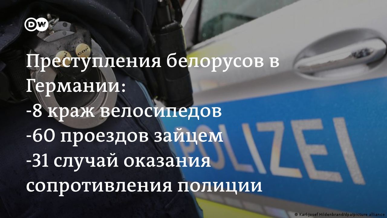 DW поинтересовалась белорусской преступностью в Германии и направила запрос в местное МВД: оказывается, белорусы в целом ведут себя хорошо. На долю граждан Беларуси в 2019 году (это самые свежие данные) в Германии пришлось около 1700 преступлений (из 700 тысяч, которые совершили иностранцы, то есть намного меньше 1 процента). Самое распространенное преступление - воровство: 583 случая.