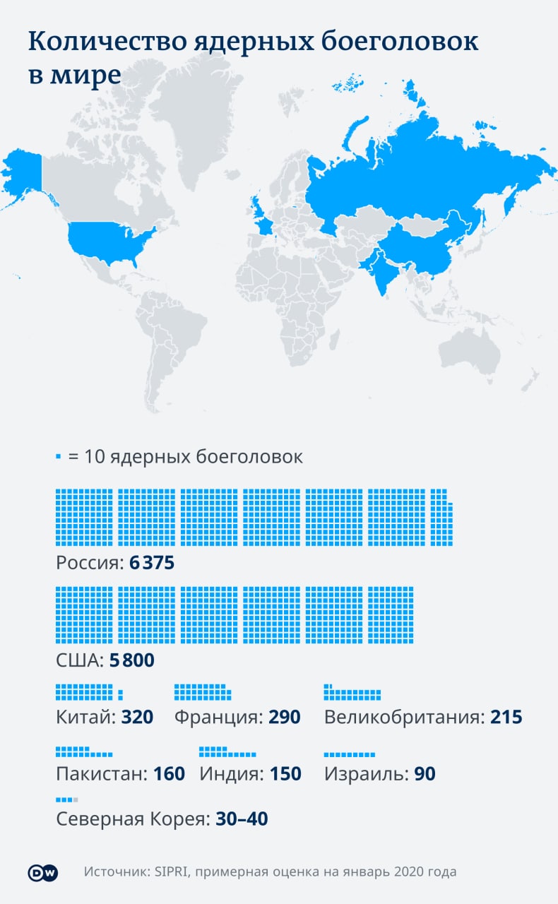 Напоминаем, какими ядерными потенциалами обладают разные страны в мире. Угрозы использовать ядерное оружие Россия озвучивала восемь лет назад в связи с аннексией Крыма, отмечают эксперты. "Российские угрозы несут в себе, в первую очередь, политическую функцию, - считает немецкий политолог Петер Рудольф. - Это сигнал США не переходить за определенную черту в войне в Украине".