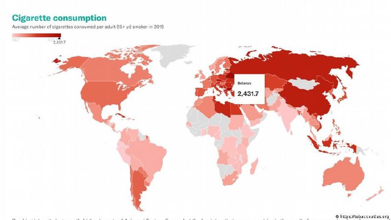 Беларусь оказалась в числе лидеров по потреблению сигарет. Исследование "Tobacco Atlas" Иллинойсского университета в Чикаго изучило ситуацию с курением в мире. Вот несколько цифр: