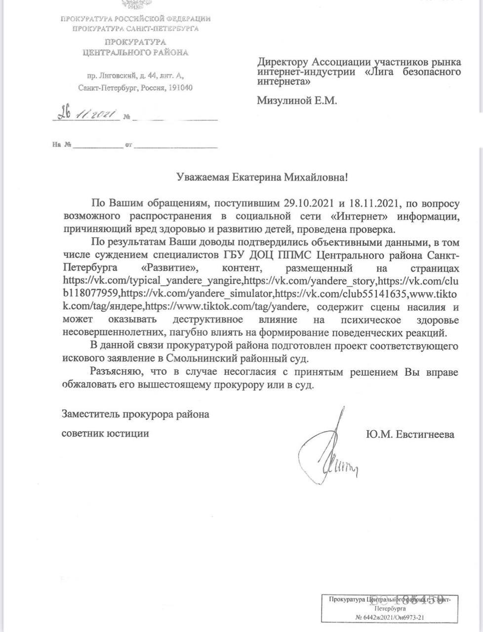 ⚡️Прокуратурой центрального района города Санкт-Петербурга по поручению Генеральной прокуратуры России рассмотрен вопрос о распространении деструктивного контента «Яндере» в соцсетях Tik Tok и Вконтакте.
