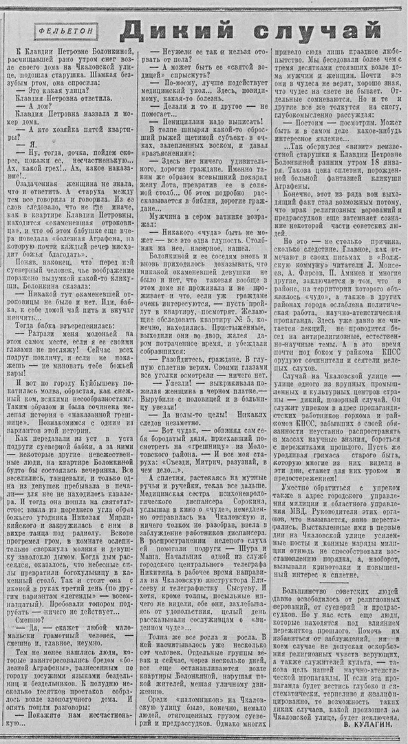 Небывалая толпа собралась на улице Чкалова в Куйбышеве (старое название Самары) в начале 1956 года. Весь город говорил о «чуде», произошедшем в доме №84. Во время банкета одна из девушек, устав ждать кавалера, закружилась в танце с иконой Николая Чудотворца. Грянул гром и «богохульница» окаменела. Так она якобы простояла 128 дней и умерла, писал журналист Дмитрий Соколов-Митрич.