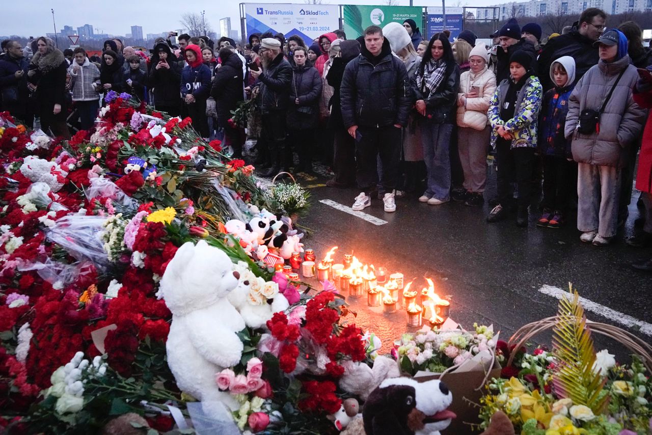 На фото — люди возлагают цветы и свечи возле выгоревшего «Крокус Сити Холла» / Alexander Zemlianichenko / AP